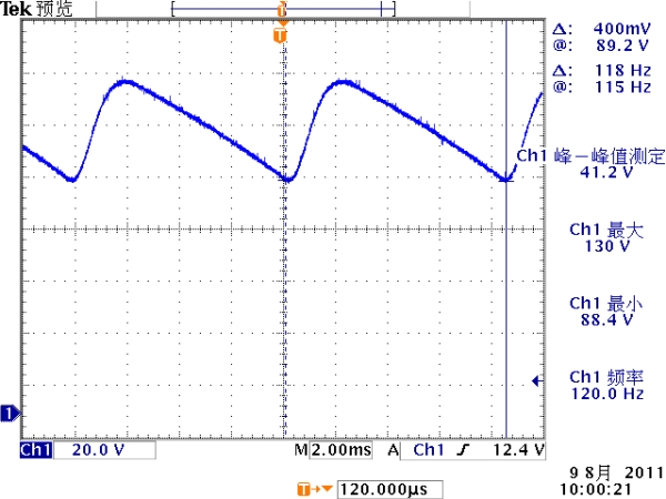 低頻紋波是與輸出電路的濾波電容容量相關。因為開關電源體積的約束,電解電容的容量不可能無約束地添加,導致輸出低頻紋波的殘留,該輸出紋波頻率隨整流電路方式的不同而不同。