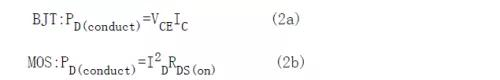 控制這個損耗的典型辦法是使功率開關(guān)導(dǎo)通期間的電壓降最小。要達到這個目的,設(shè)計者有必要使開關(guān)作業(yè)在飽滿狀態(tài)。這些條件由式(2a)和式(2b)給出,通過基極或柵極過電流驅(qū)動,確保由外部元器件而不是功率開關(guān)自身對集電極或漏極電流進行控制。