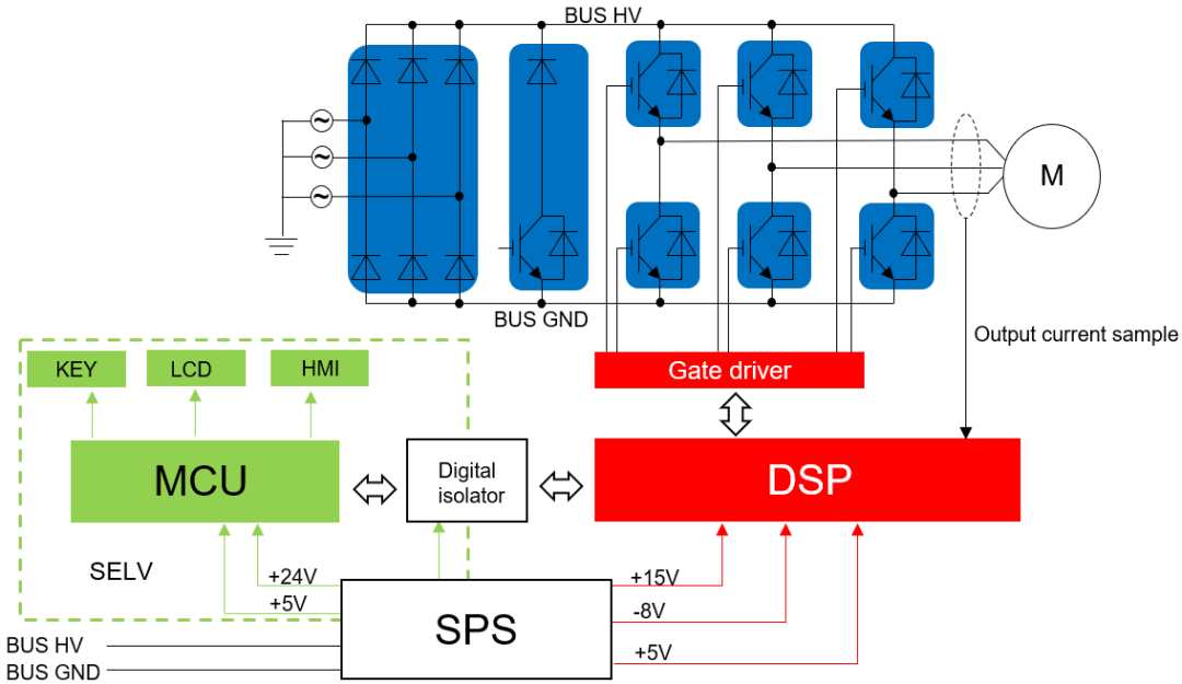 如圖4所示三相變頻器中,左下角綠色虛線圍起來的部分就是SELV電路,輔助開關電源SPS左側的供給MCU+24V+5V兩路開關電源SPS的其余的電壓輸入輸出電氣連接點之間,都必須滿足加強絕緣要求。