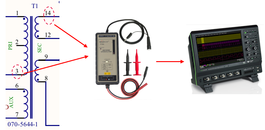回到本文的重點,接下來測試一次側高壓端與SELV電路之間的重復峰值電壓是否超過750V閾值電壓。有經驗的同學都知道,在開關電源中,重點是要找到變換器中的動點,也就是電壓的變化率dv/dt最大的節(jié)點,在圖5中,一次側高壓端的監(jiān)測點就可以選為Q1Drain極,也就是變壓器T1pin 3,安全二次側SELV的監(jiān)測點既可以選擇變壓器T1pin 12,也可以選擇變壓器T1pin 14,最后以正常帶載工況下一次側、二次側之間檢測到最大電壓為作為設定局部放電電壓UPD的基準。