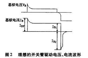 開關(guān)管的損耗與其基極的驅(qū)動電壓、電流的波形有直接的關(guān)系,理想的基極驅(qū)動波形如圖2所示。