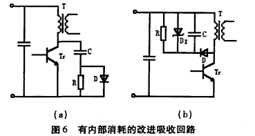 圖6(b)是將變壓器T的原副邊積存的能量轉(zhuǎn).移到電容C上,然后用電阻R將這局部能量耗費掉,也可把電阻R換成穩(wěn)壓二極管D,以防止能量的耗費。