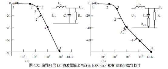 濾波電容有ESR的LC濾波器幅頻特性如圖6.35b的曲線123456。大多數(shù)濾波電容具有ESR。在f0以上的低頻段,容抗遠(yuǎn)遠(yuǎn)大于ESR,從Uo看到阻抗僅是容抗起首要作用,斜率仍為-40dB/dec;在更高頻時(shí),esrRC<<ω1,從輸出端看的阻抗僅僅ESR,在此頻率規(guī)模,電路變?yōu)?/span>LR濾波,而不是LC濾波。即