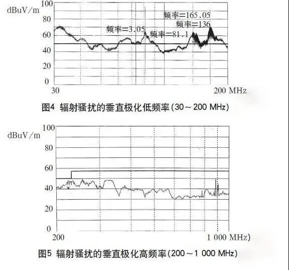 本開關電源 經過了傳導煩擾的檢驗,檢驗波形如圖2、3所示。輻射煩擾高頻段230~1000MHz也檢驗合格,如圖5所示。只是在30~200MHz頻段規(guī)模內的垂直極化目標超標, 超標20dB,如圖4所示。