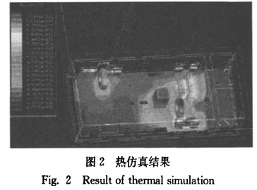 依據(jù)主要發(fā)熱元器件的損耗計算公式,得到各損耗值,將其導入仿真軟件;應用Ansoft仿真軟件的內部求解器取得實踐電路的3D發(fā)熱模型,如圖2所示。從圖中能夠明晰地看到電路內部及各個元器件上的熱量散布狀況。依據(jù)仿真結果(圖2)可知,功率MOSFET上的熱量和變壓器的熱量最高(紅色局部),這與從電路理論上剖析求得的這兩種器件的功耗(見表2)相吻合。