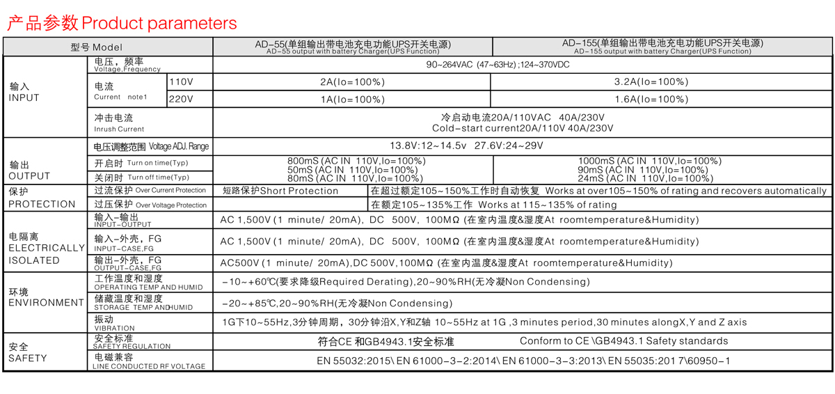 國際通用全范圍交流輸入 有短路、過載、過壓保護 內置EMI濾波器、紋波極小 電池低電壓保護及電池極性保護 100%滿載老化測試 開關工作頻率: PFC:67KHZ,PWM:134KHZ
